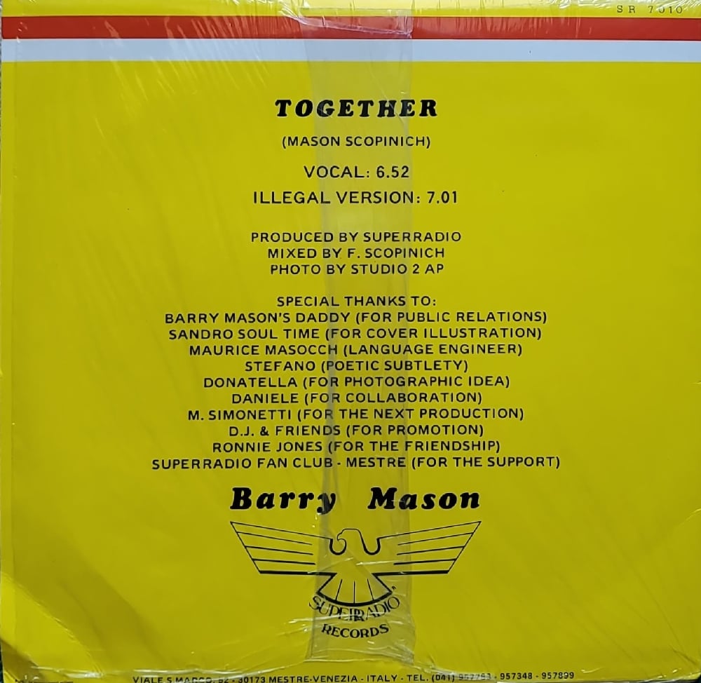 Barry Mason – TogetherLabel: Superradio Records – SR 7010, Superradio Records – SR 7007Format: 2 × Vinyl, 12", Limited EditionCountry: ItalyReleased: 1984Genre: ElectronicStyle: Italo-DiscoCondition: VG+ / NM